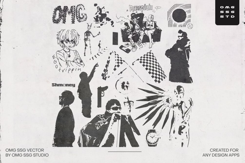 Dive into a unique aesthetic with our collection of 18 vector elements! Inspired by the vibe of Shmoney and artists like Rocket, Lildrughill, and Fresco, these elements bring an unparalleled blend of creativity and modernity to your projects. Each piece reflects a distinct visual identity that will make your designs unforgettable. Simply add them to your work, and they will instantly elevate any composition! Create, experiment, and get inspired!