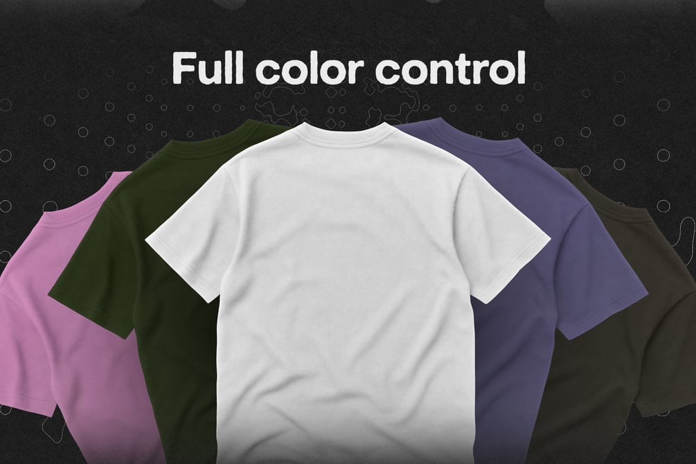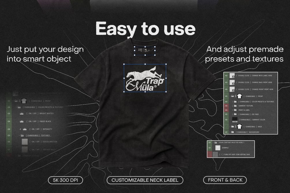 Customize the T-shirt color with light or dark fabric presets. Adjust the neck label – add your own branding or leave it blank. Apply effects like vintage wash or dye fade using layered adjustments. Your artwork automatically matches the T-shirt's shadows and movement without manual editing.
